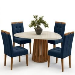 Mesa Salinas 160 (Tampo Londres s/ vidro) Cinamomo com 6 Cadeiras Las Vegas Veludo Azul 24 – CEL MÓVEIS + OURO DECOR