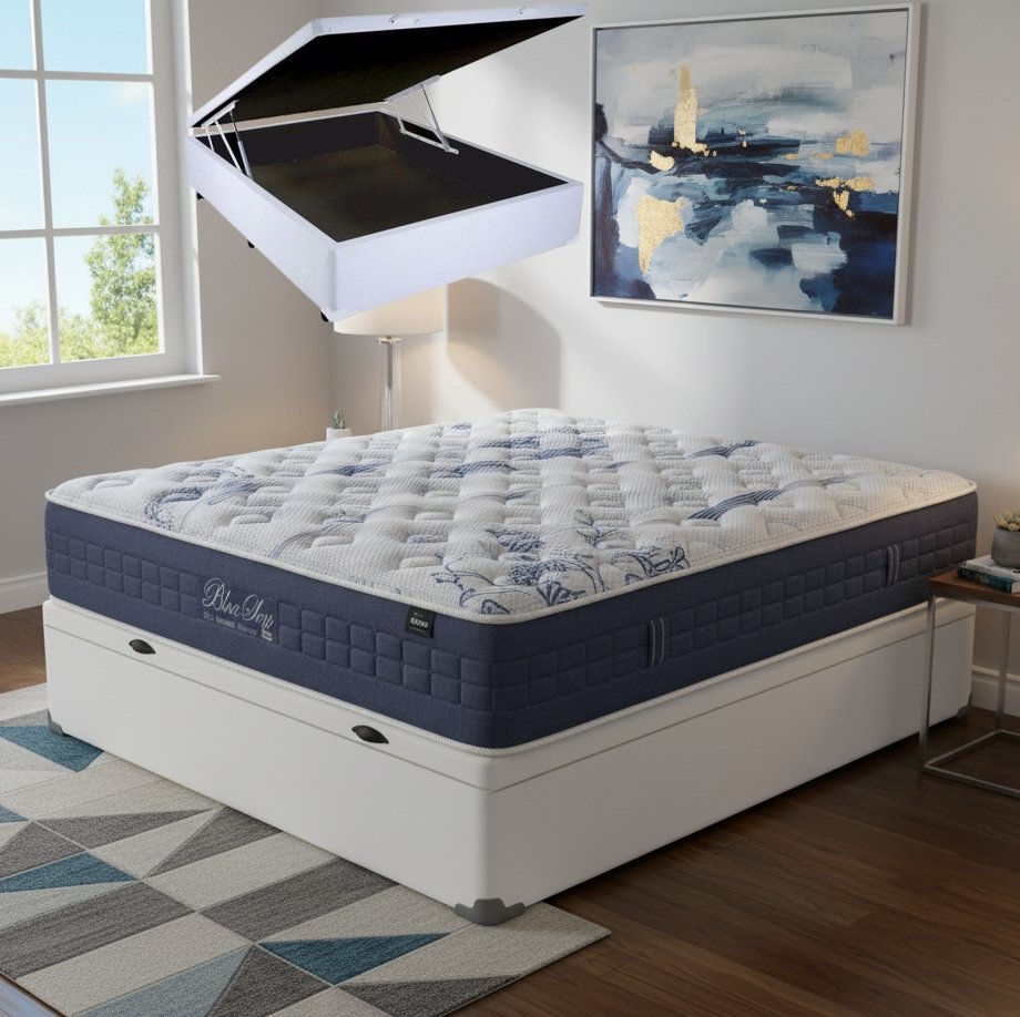 Colchão Casal Blue Sea D28 + Base Box Baú Corino Branco – ANJOS COLCHÕES + BIOSTAR