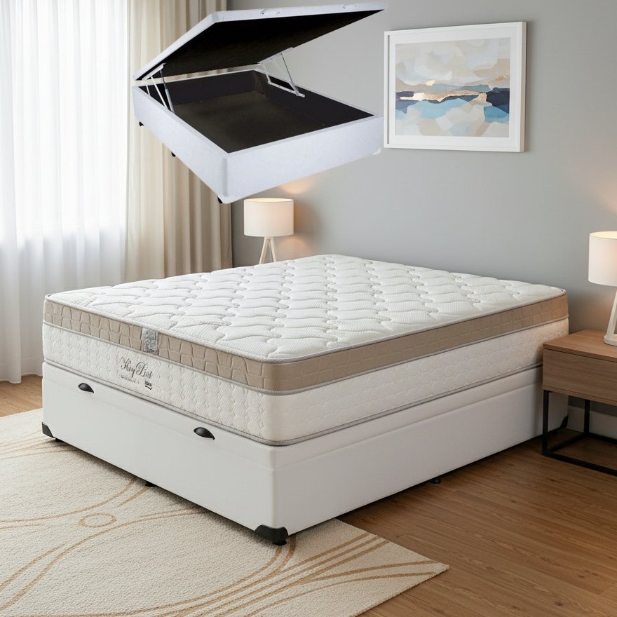 Colchão Casal King Best D28 + Base Box Baú Corino Branco – ANJOS COLCHÕES + ALTO NÍVEL CAMAS E COLCHÕES