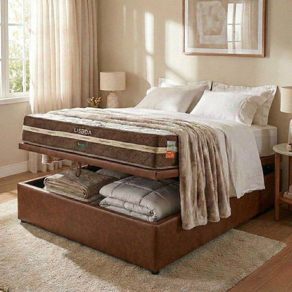Colchão Casal Lisboa 24 cm D28 Molas Ensacadas + Base Baú Corino Marrom – ECOTEC + ALTO NÍVEL