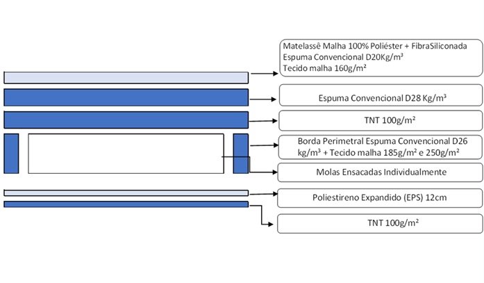 – Tampo matelassê em malha 100% poliéster, fibra siliconada e espuma D20
