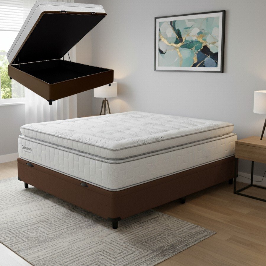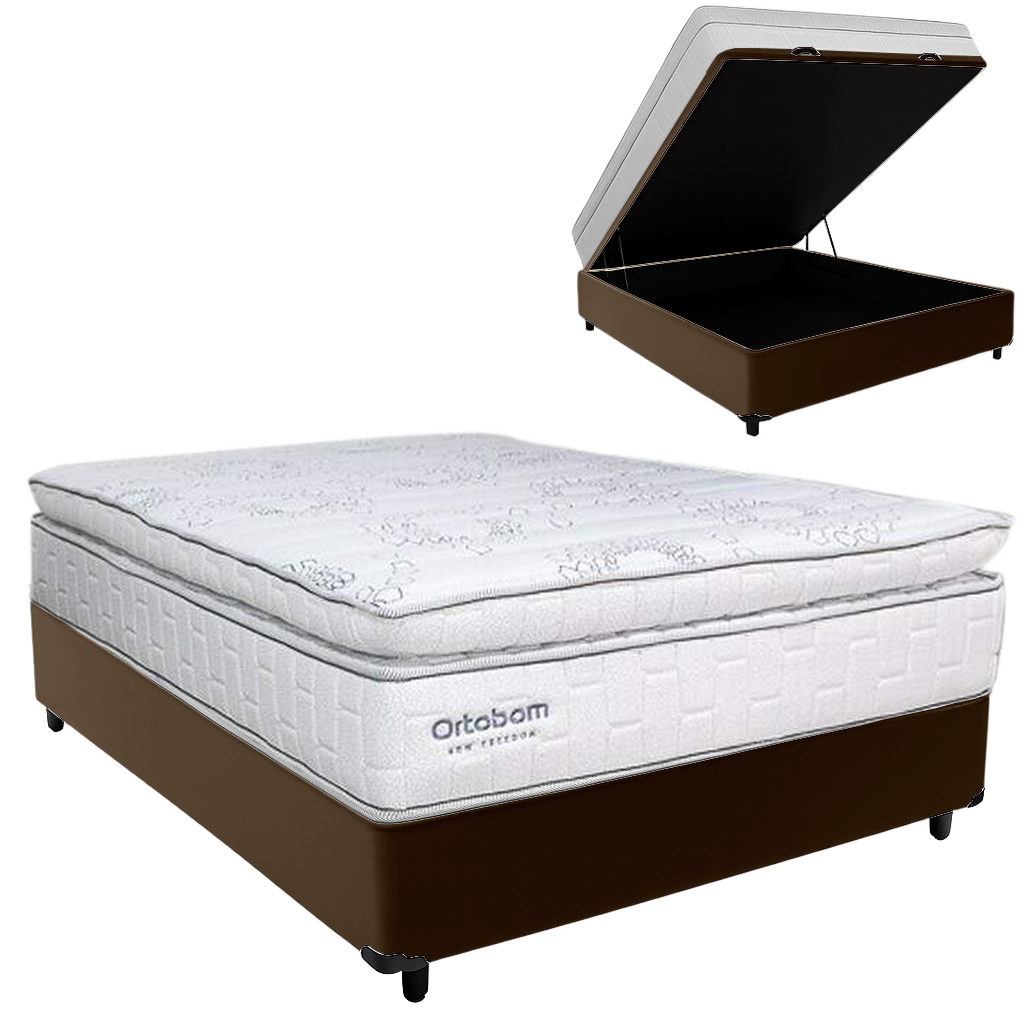 Colchão Casal New Freedom D33 + Base Box Baú Corino Marrom – ORTOBOM + ALTO NÍVEL CAMAS E COLCHÕES