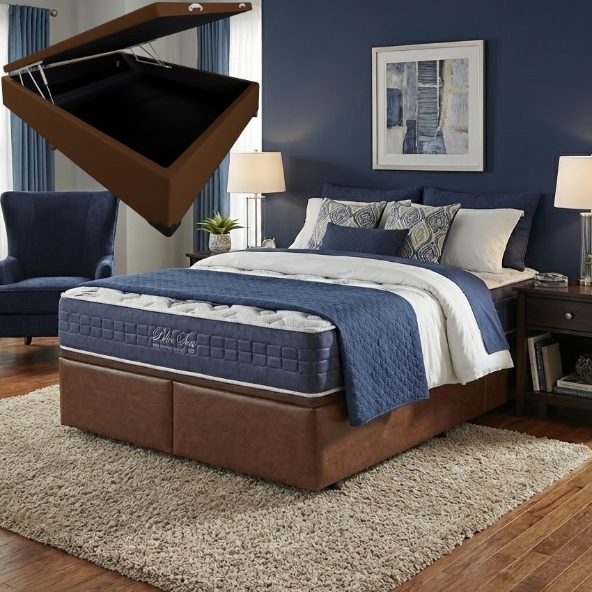 Colchão Queen Blue Sea D28 + Base Box Baú Corino Marrom – ANJOS COLCHÕES + ALTO NÍVEL CAMAS E COLCHÕES