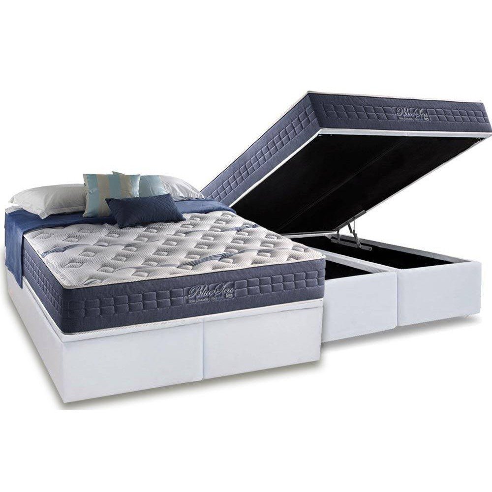 Colchão Queen Blue Sea D28 + Base Box Baú Corino Branco – ANJOS COLCHÕES + BIOSTAR
