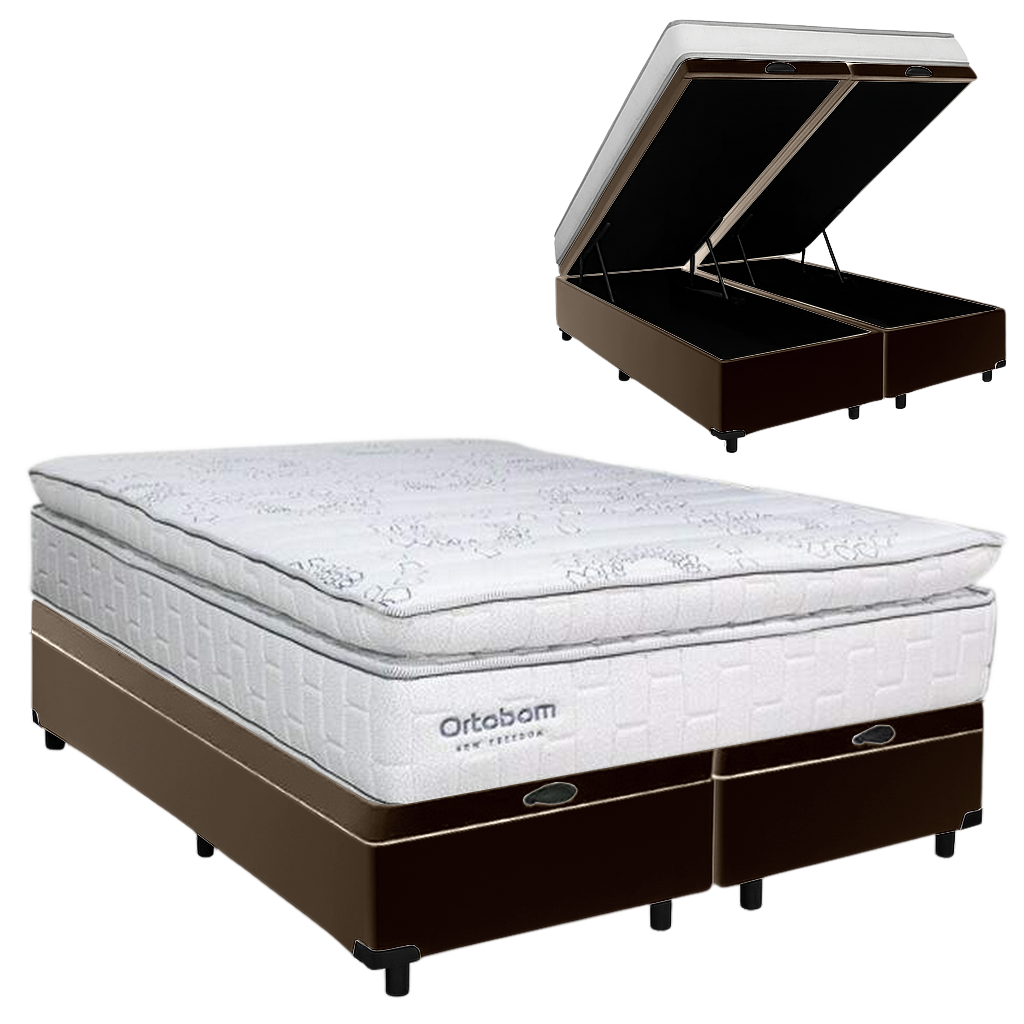 Colchão Queen New Freedom + Base Box Baú Corino Marrom – ORTOBOM + ALTO NÍVEL CAMAS E COLCHÕES