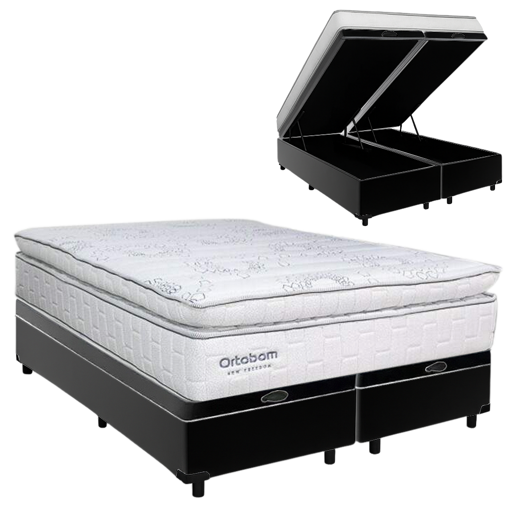 Colchão Queen New Freedom 32 cm D33 Molas Ensacadas + Base Baú Corino Preto – ORTOBOM + ALTO NÍVEL