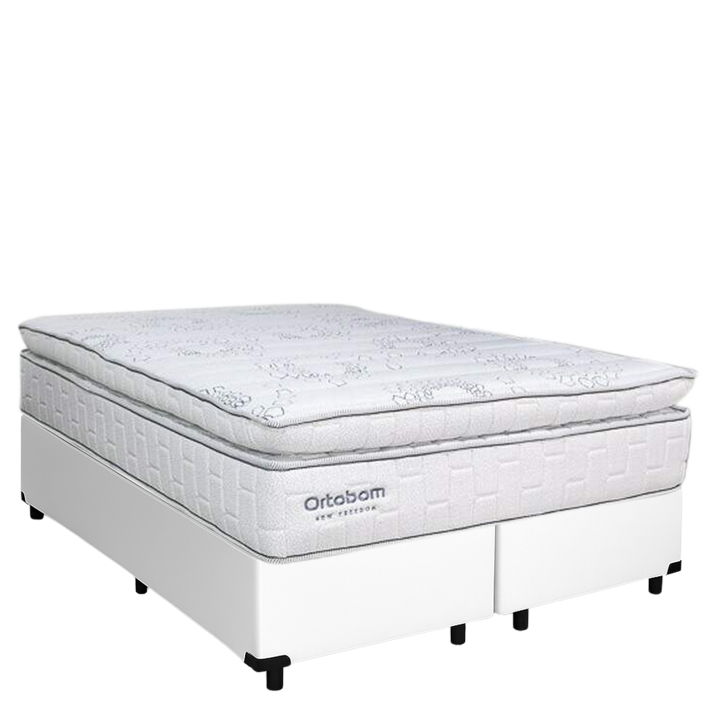 Colchão Queen New Freedom + Base Box Simples Corino Branco – ORTOBOM + ALTO NÍVEL CAMAS E COLCHÕES