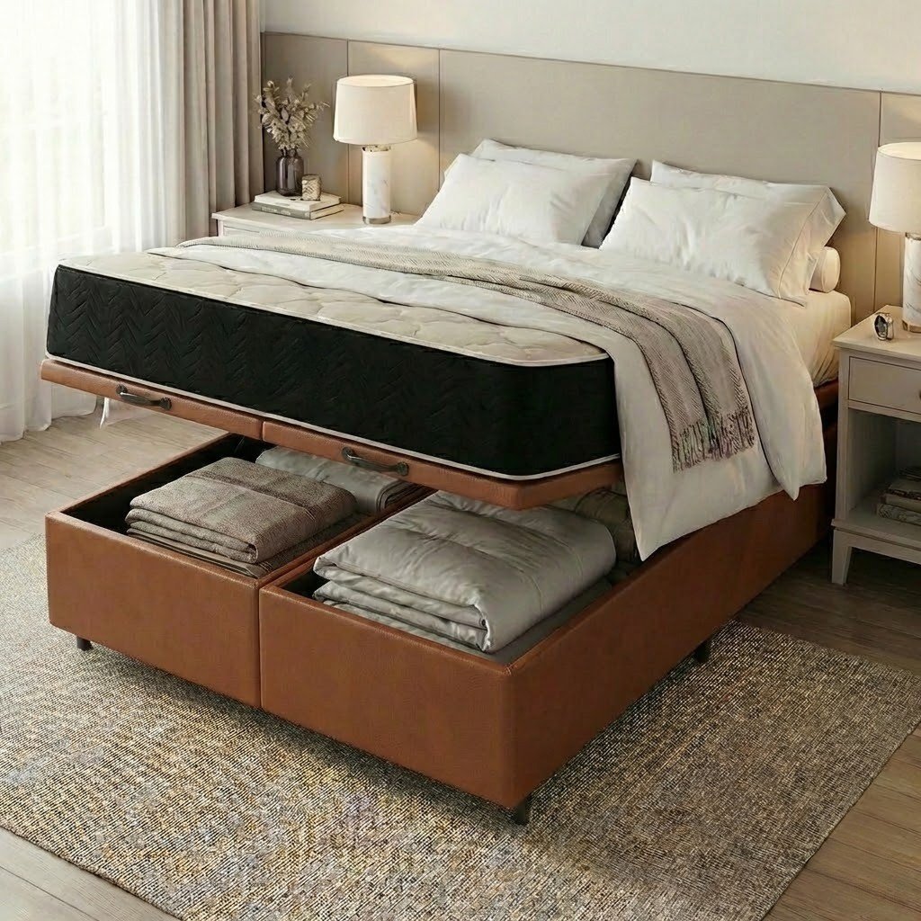 Colchão Queen Premium D45 + Base Box Baú Corino Marrom – ECOTEC + ALTO NÍVEL CAMAS E COLCHÕES