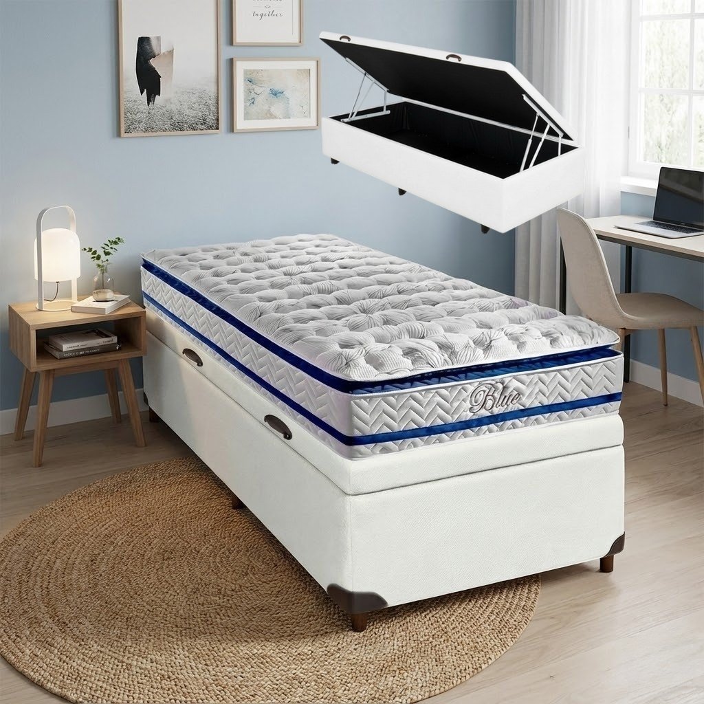 Colchão Solteiro Blue D33 + Base Box Baú Corino Branco – PAROPAS/BIOSTAR