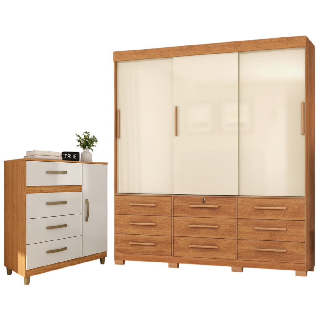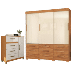 Guarda-Roupa 3 Portas Toronto RP1930 + Cômoda 4 Gavetas com Sapateira Leme CO240 Cinamomo/Off White/Cinamomo – FELLICCI