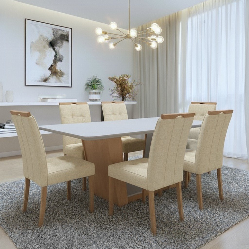 Mesa Apogeu (Tampo Maxi) 170 Amêndoa Clean/Off White com 6 Cadeiras Sophia Linho Bege 200 – LOPAS + WM DECOR