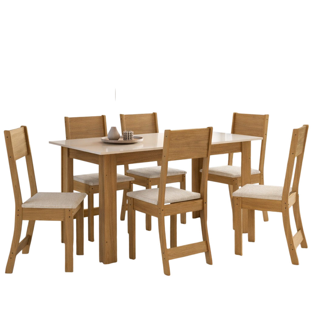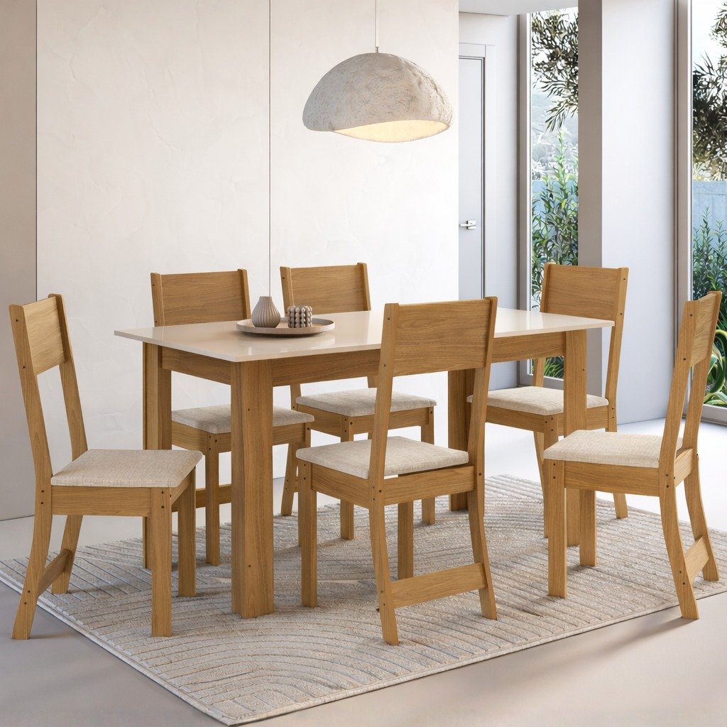 Mesa Atlanta 150 Freijó/Off White com 6 Cadeiras Karla Linho Bege – INDÉKES