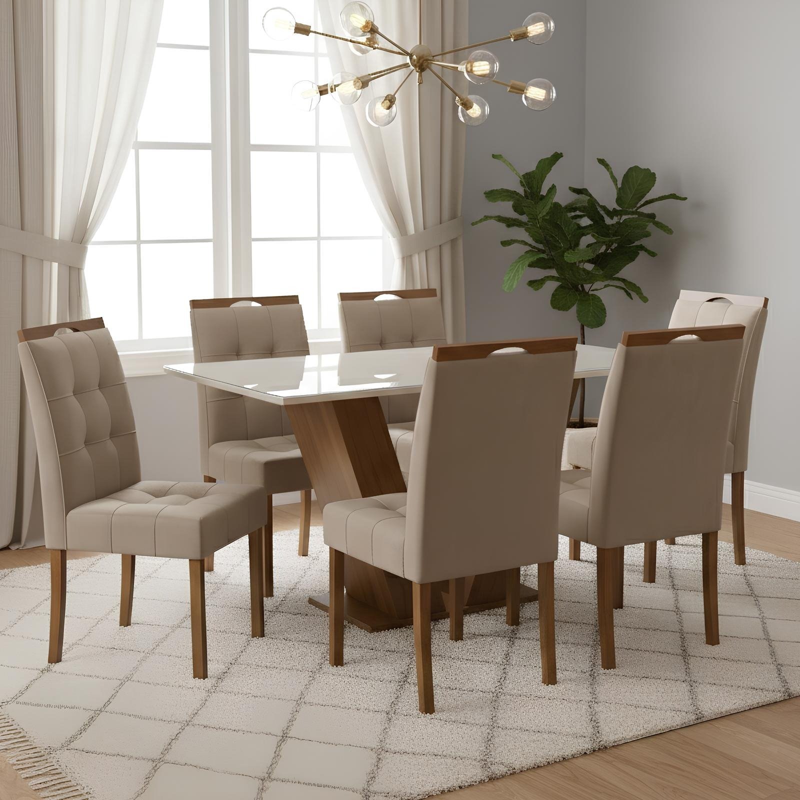 Mesa Classic 160 Cinamomo/Off White com 6 Cadeiras Sophia Veludo Bege – CEL MÓVEIS + WM DECOR