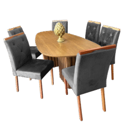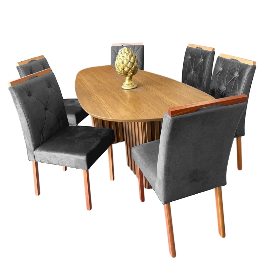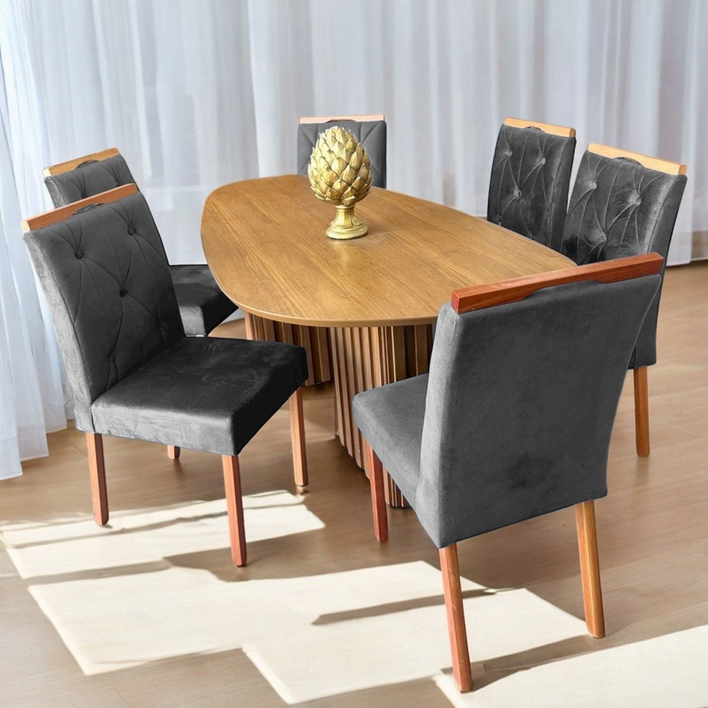 Mesa Isis 180 Freijó com 6 Cadeiras Yasmim Veludo Cinza Grafite – LEIFER + KM DECOR
