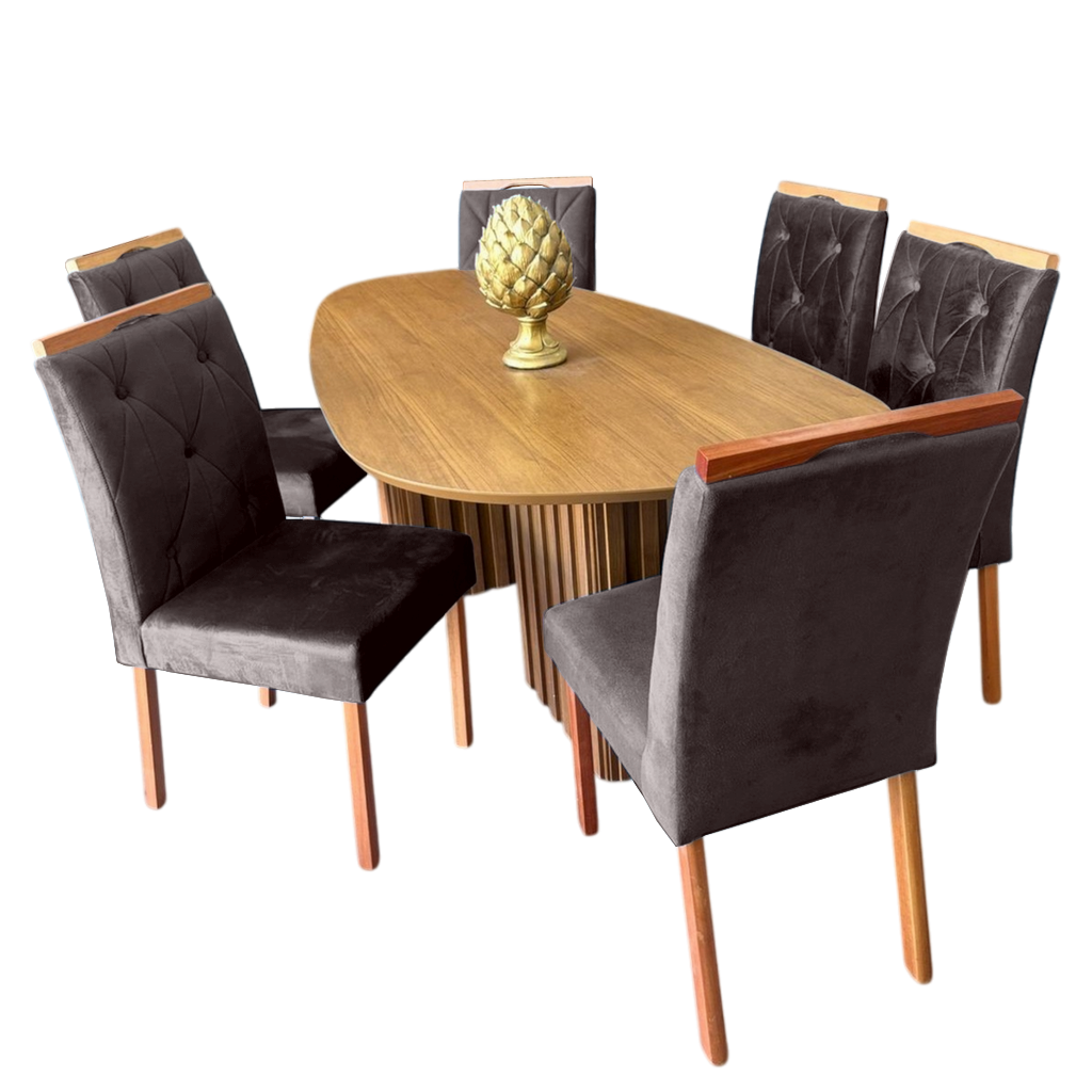Mesa Isis 180 Freijó com 6 Cadeiras Yasmim Veludo Marrom – LEIFER + KM DECOR