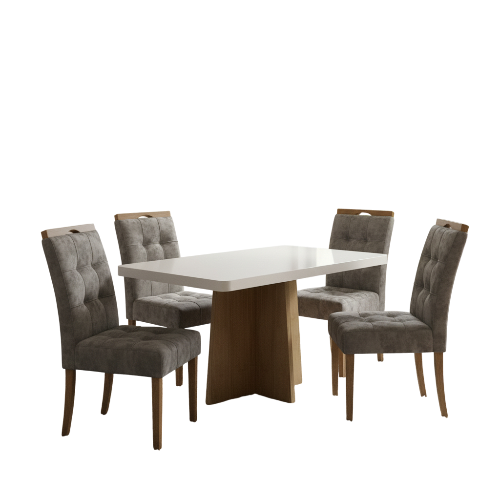 Mesa Jade 120 (Tampo 40 mm) Cinamomo/Off White com 4 Cadeiras Sophia Veludo Cinza Grafite – VALDEMÓVEIS + WM DECOR