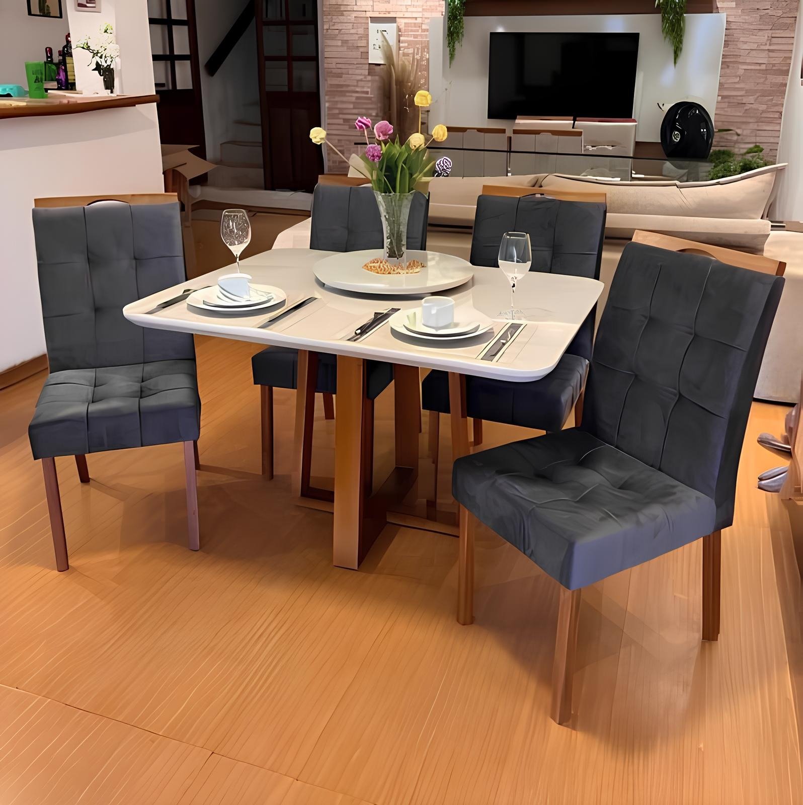 Mesa Pedro 90 Mel/Off White com 4 Cadeiras Sophia Veludo Cinza Grafite – ART ASSENTOS + WM DECOR