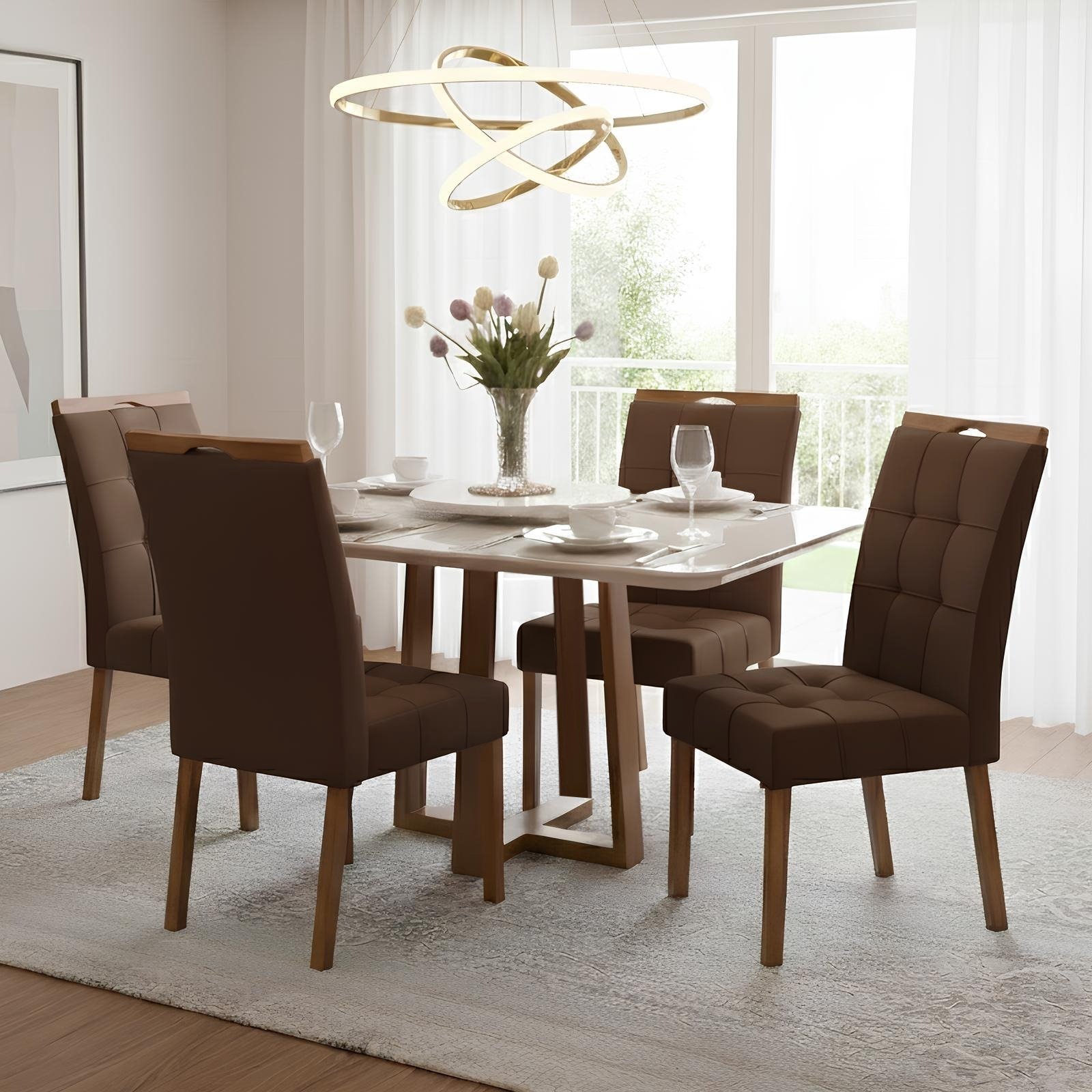 Mesa Pedro 90 Mel/Off White com 4 Cadeiras Sophia Veludo Marrom – ART ASSENTOS + WM DECOR