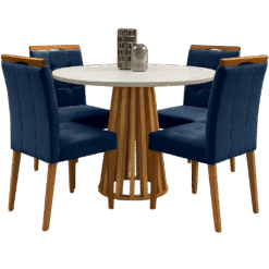 Mesa Redonda Berlim 100 Cinamono/Off White com 4 Cadeiras Sophia Veludo Azul – CEL MÓVEIS + WM DECOR