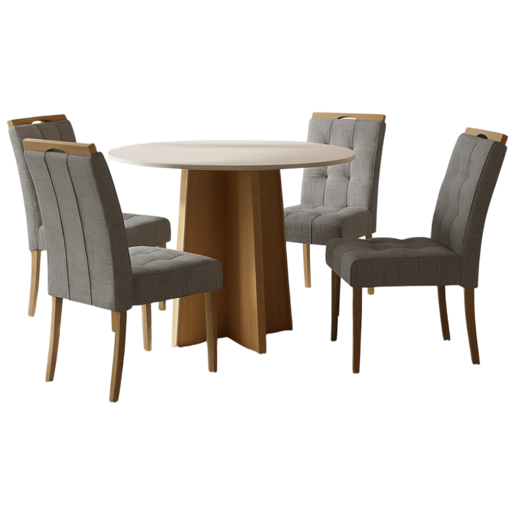 Mesa Redonda Celebrare 100 Amêndoa Clean/Off White com 4 Cadeiras Sophia Linho Cinza Grafite 202 – LOPAS + WM DECOR
