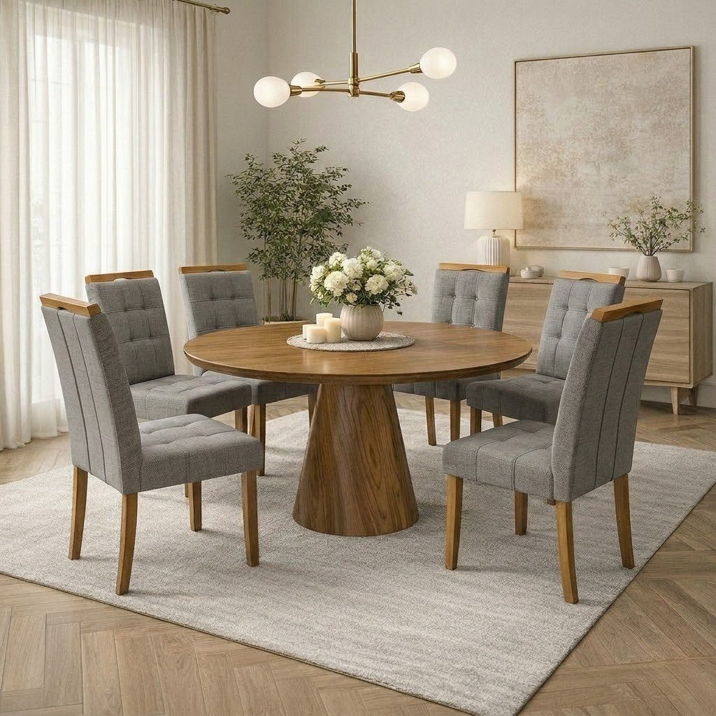 Mesa Redonda Malva 130 Mel com 6 Cadeiras Sophia Linho Cinza Grafite 206 – J SILVA MÓVEIS + WM DECOR