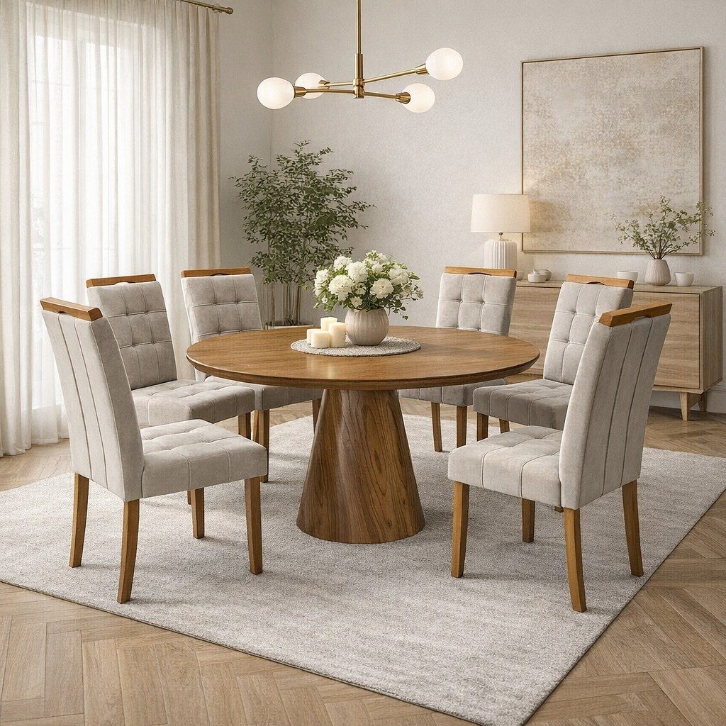 Mesa Redonda Malva 130 Mel com 6 Cadeiras Sophia Veludo Bege 100 – J SILVA MÓVEIS + WM DECOR