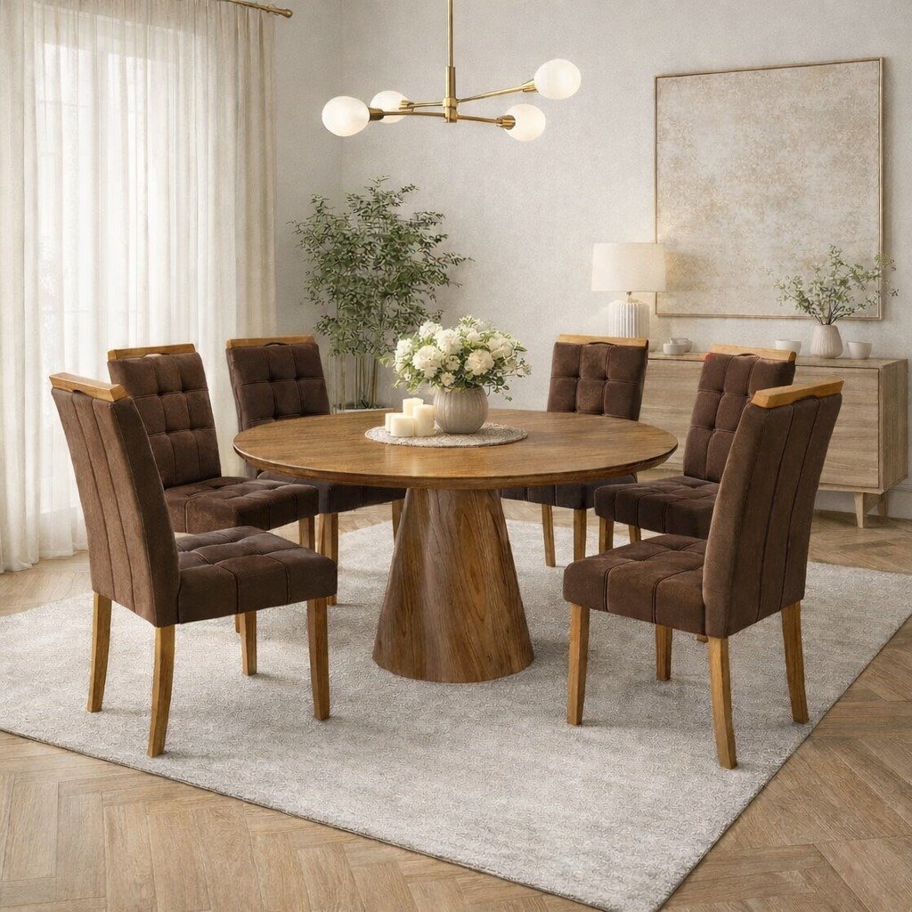 Mesa Redonda Malva 130 Mel com 6 Cadeiras Sophia Veludo Marrom 103 – J SILVA MÓVEIS + WM DECOR