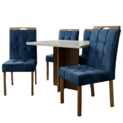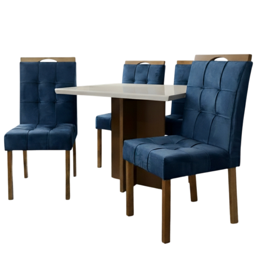 Mesa Salinas 120 Cinamomo/Off White com 4 Cadeiras Sophia Veludo Azul – CEL MÓVEIS + WM DECOR
