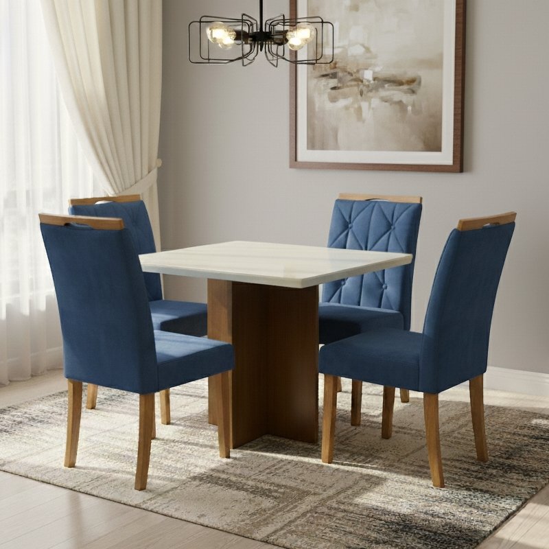 Mesa Salinas/Helô/Los Angeles 90 Cinamomo/Off White com 4 Cadeiras Yasmim Veludo Azul – CEL MÓVEIS + KM DECOR