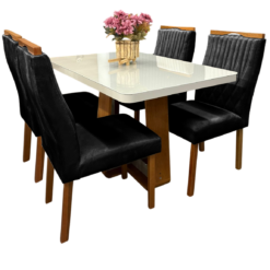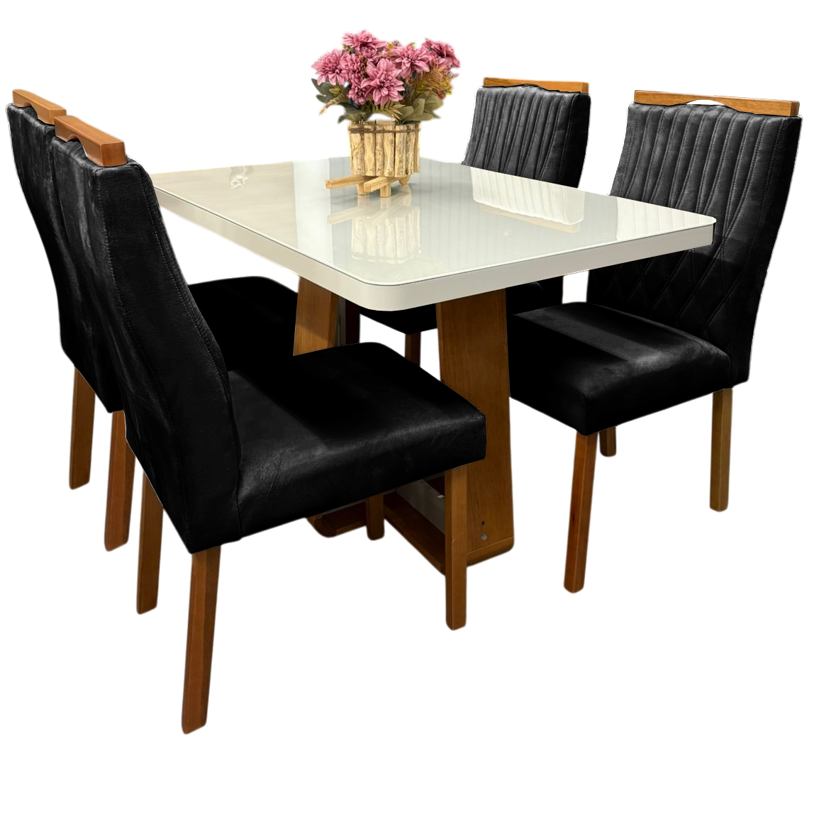 Mesa Sintonia (Tampo Maxi) 120 Amêndoa Clean/Off White com 4 Cadeiras Gênova Veludo Preto – LOPAS + ART ASSENTOS