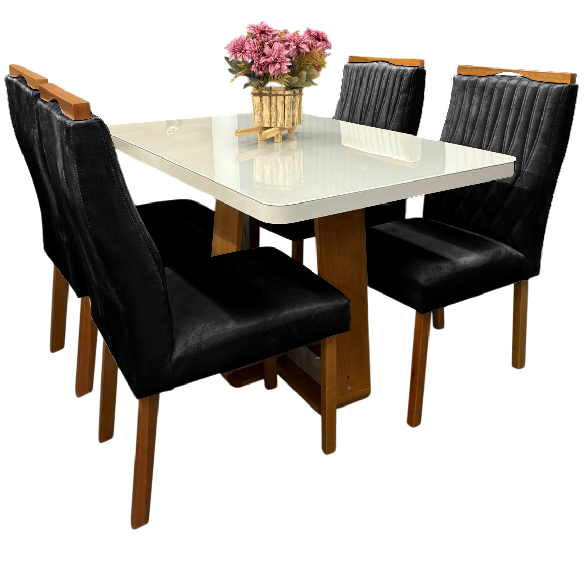 Mesa Sintonia (Tampo Maxi) 120 Amêndoa Clean/Off White com 4 Cadeiras Gênova Veludo Preto – LOPAS + ART ASSENTOS