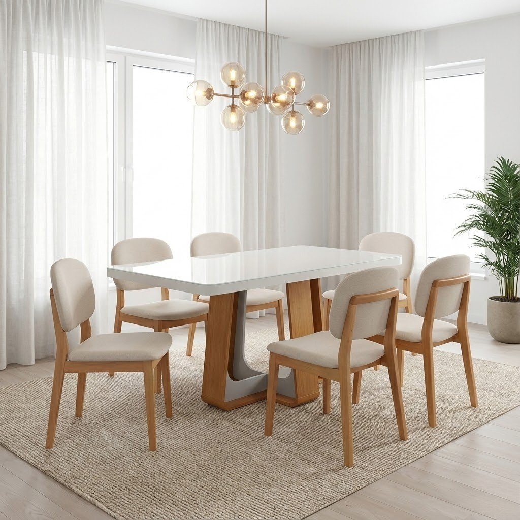 Mesa Sintonia (Tampo Maxi) 170 Amêndoa Clean/Off White com 6 Cadeiras Gaya Linho Bege 01 – LOPAS + J SILVA MÓVEIS