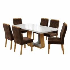 Mesa Sintonia (Tampo Maxi) 170 Amêndoa Clean/Off White com 6 Cadeiras Gênova Veludo Marrom – LOPAS + ART ASSENTOS