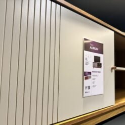 – Uma porta de correr MDF 15 mm em detalhes frisados e puxador na cor cobre